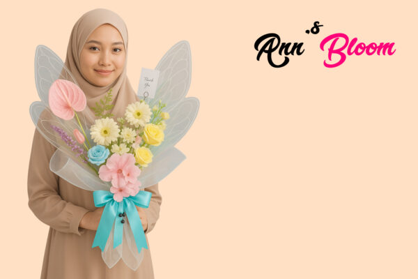 Fairy Wings Pastel Bouquet memadukan keindahan bunga-bunga lembut seperti anthurium pink, gerbera putih, mawar kuning, lavender, dan hydrangea biru, dibalut dengan pita satin biru muda serta hiasan sayap transparan menyerupai sayap peri.