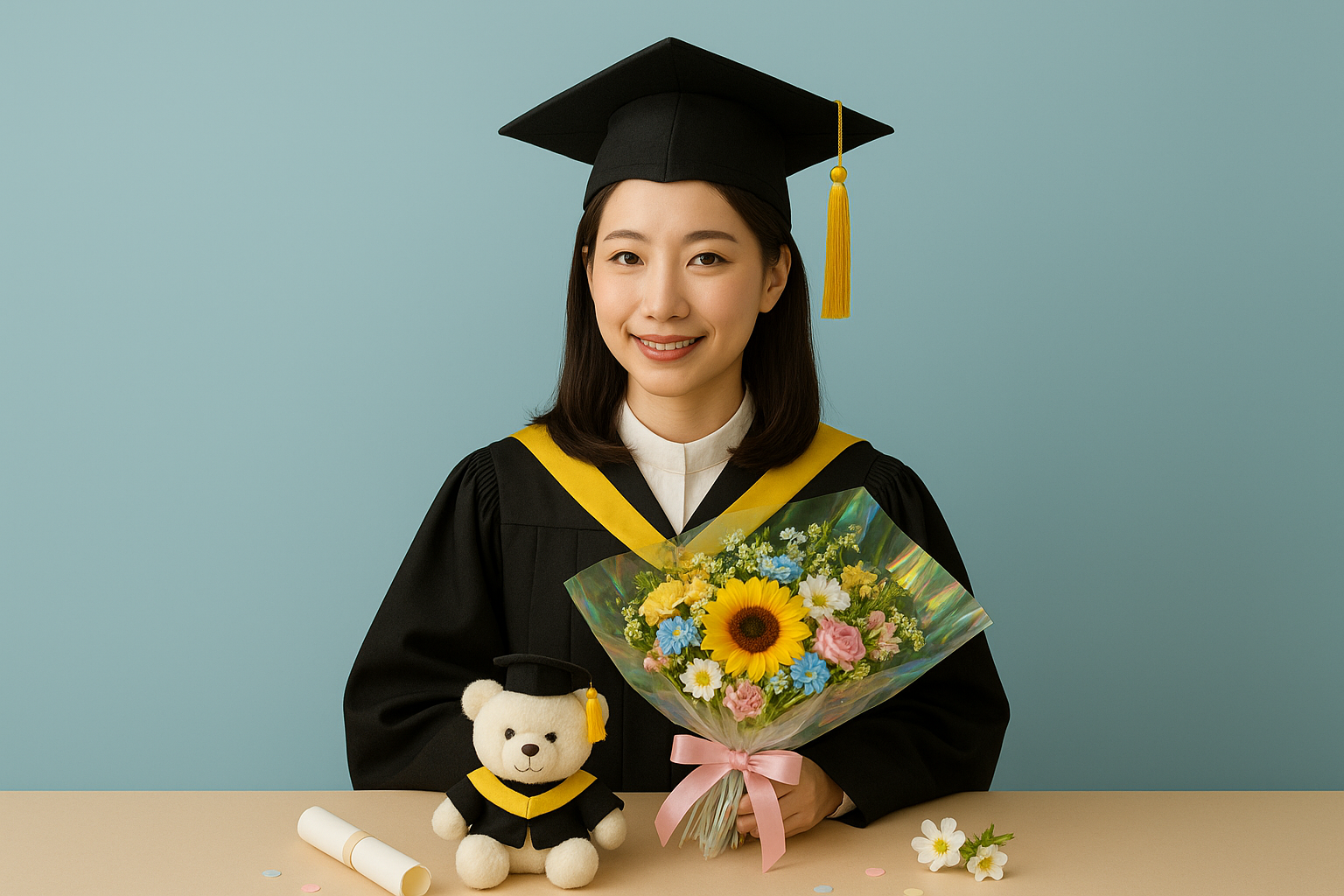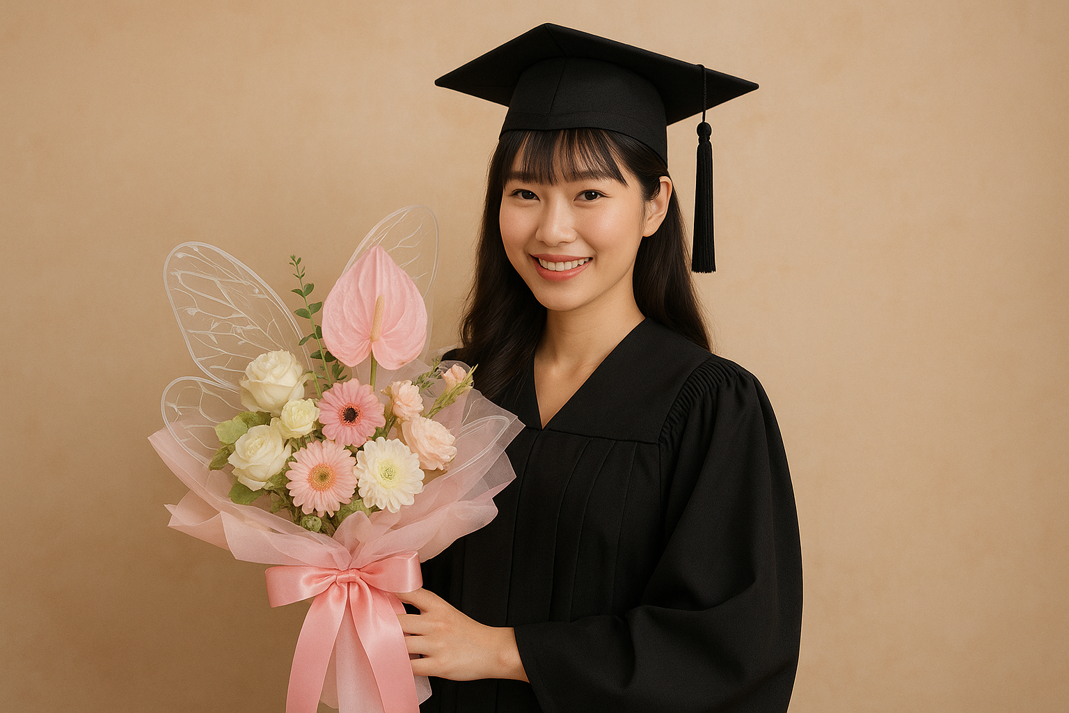 Dibalut dalam kertas bunga berwarna blush pink dan pita satin lembut, buket ini berisi kombinasi bunga mawar, gerbera, dan anthurium dengan nuansa krem, putih, serta pink muda. Setiap elemen dirangkai dengan hati-hati untuk menciptakan kesan feminin dan istimewa—sempurna untuk dipadukan dengan toga